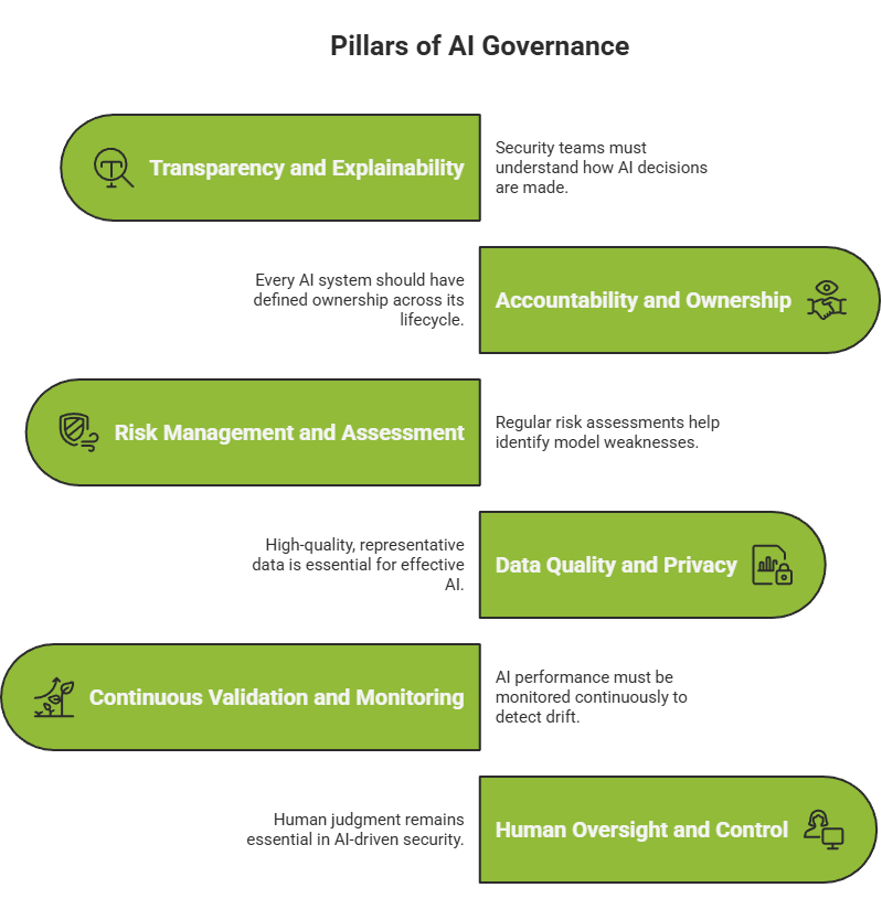Effective AI governance in cybersecurity is built on six foundational pillars that ensure AI systems remain trustworthy, effective, and aligned with organizational values.