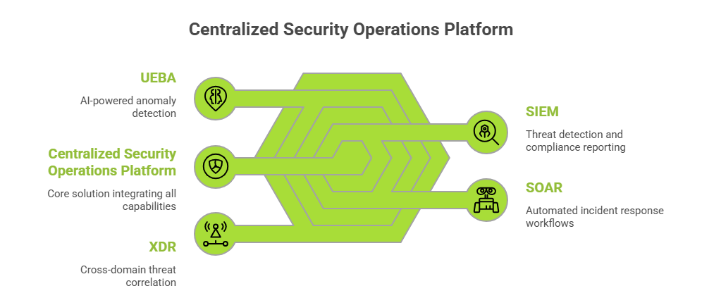 A centralized security operations platform integrates multiple cybersecurity capabilities into a unified solution, eliminating the complexity of managing disparate tools. Unlike traditional SIEM systems that focus solely on log management, modern platforms combine: