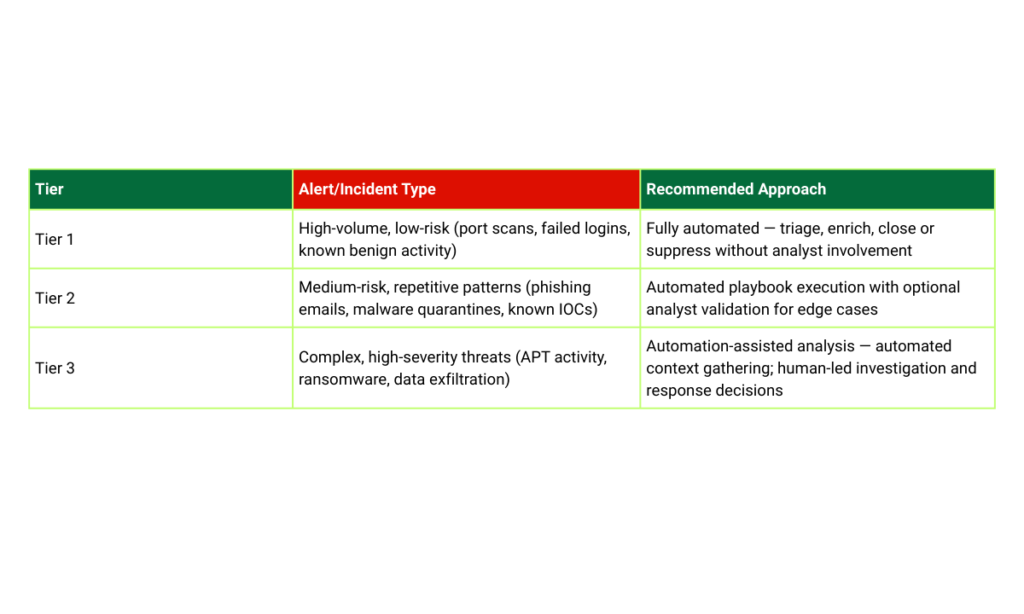 Not all security tasks are equal candidates for automation. Leading SOCs implement a tiered model that categorizes alerts and incidents by complexity, risk, and required expertise – ensuring automation is applied where it delivers the highest value without introducing unacceptable operational risk.
