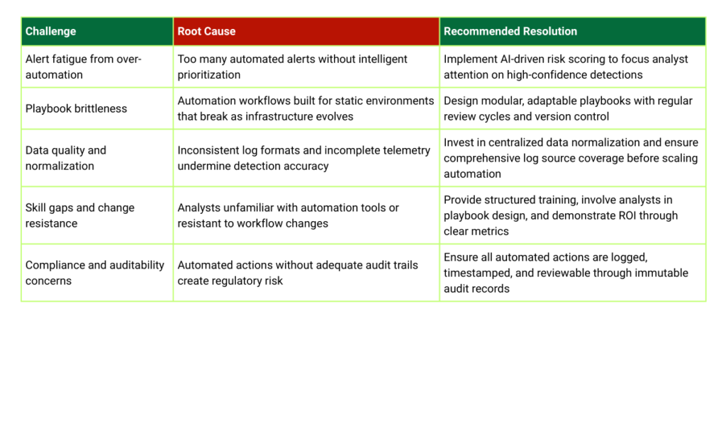 Despite its compelling benefits, SOC automation is not without challenges. Organizations that rush into automation without addressing foundational issues often find themselves with complex, brittle workflows that create new problems rather than solving existing ones. Anticipating and proactively managing these challenges is essential for sustainable success.