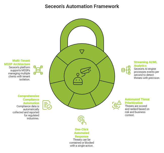Seceon’s aiSIEM™ platform exemplifies this approach, using streaming machine learning to analyze billions of network events, logs, and flows in real time – delivering high-fidelity threat detection that dramatically reduces noise and false positives.