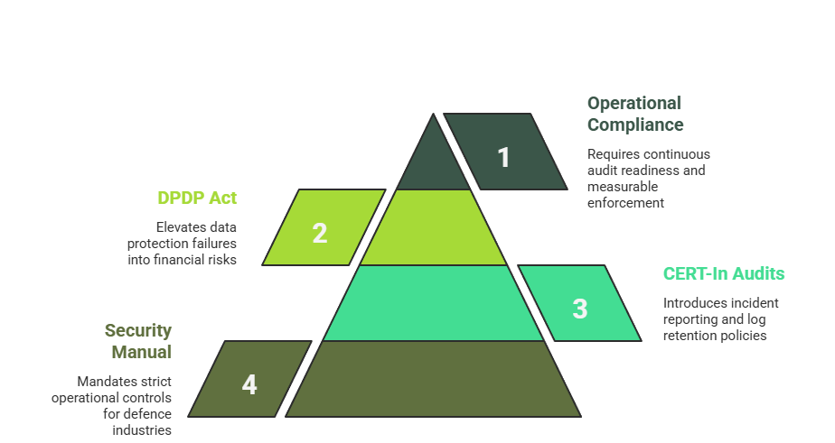 India’s regulatory framework has matured rapidly. The Security Manual for Licensed Defence Industries mandates strict operational controls, including biometric access baselines and air-gapped networks for classified projects. CERT-In’s comprehensive audit policy introduces six-hour incident reporting windows and extended log retention requirements. The DPDP Act elevates data protection failures into significant financial and legal risk.