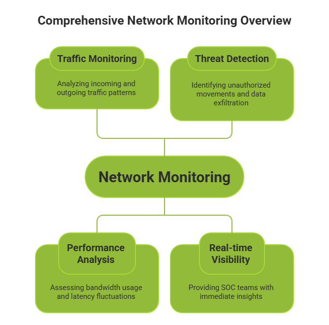 Network monitoring is the continuous surveillance of network traffic, application behavior, device activity, and infrastructure health to detect both operational issues and cybersecurity threats proactively. It consists of: