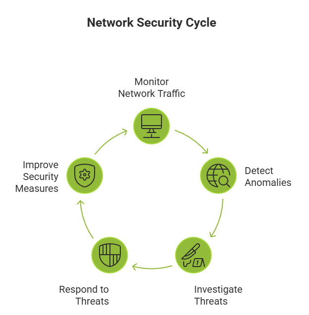 Traditional signature-based detections only catch known threats. Network monitoring with behavioral analytics enables spotting: