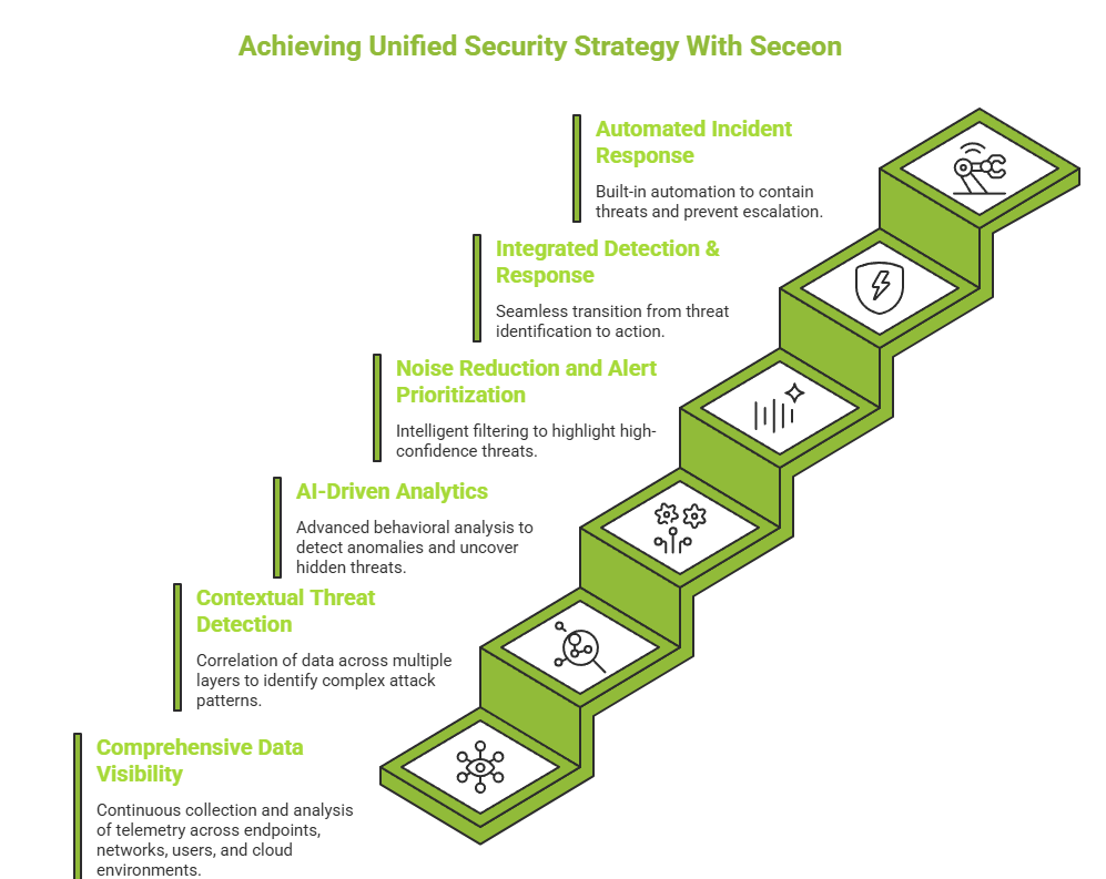 Seceon addresses this challenge by bringing together the core capabilities associated with modern security operations into a single, unified platform-connecting visibility, detection, and response in a seamless manner.